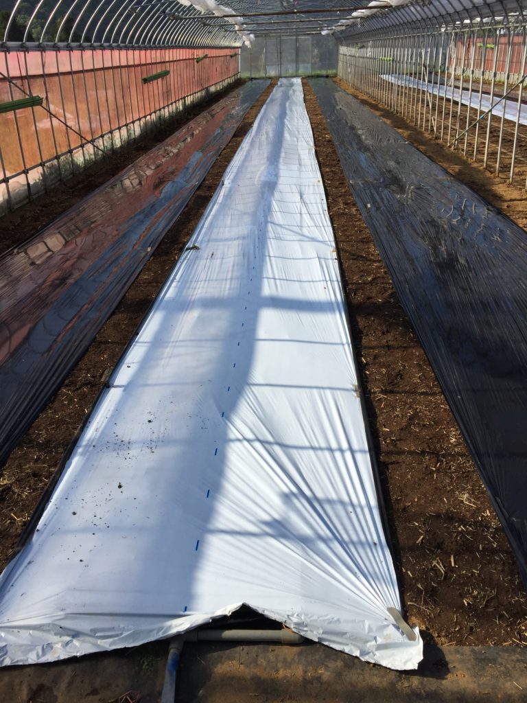 そのあと、土づくりが完了しているトマトハウスで、マルチ張りをします。真ん中が白マルチで、両サイドに黒マルチを張りました。今回初の試みだそうです。パンダ模様となります。この試みで、白黒がはっきり尽きます。なぜそうするのか聞き忘れました。通称、パンダ作戦。白マルチは土の温度を極端に上げないようにするためです。頃合いが大事で、YouTubeで有名な塚原農園では一昨年は深緑のマルチを使用しましたが、昨年はチョコレート色のチョコマルチを使用して非常に良い感じだそうです。農家の皆さんはさまざまに工夫しています。