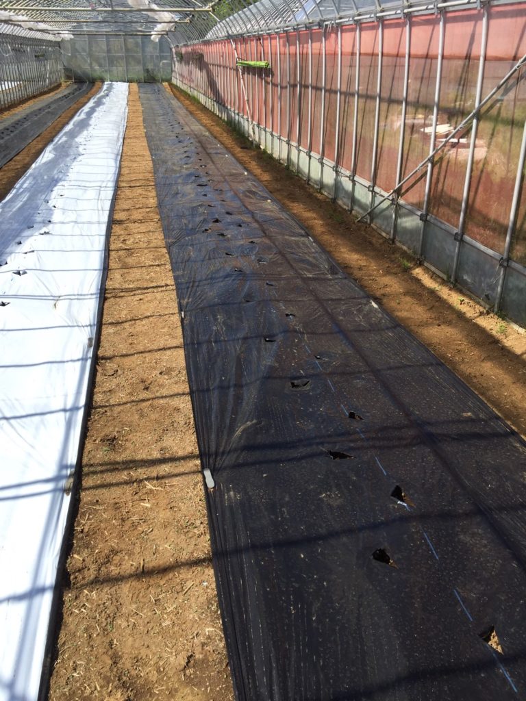 午後は青根のトマトハウスでマルチにカッターで穴をあけてトマトの定植の準備を進めます。定植の穴にアルバリンを1gくらい入れます。最低限の農薬で吉見さんのトマトは超低農薬栽培です。
