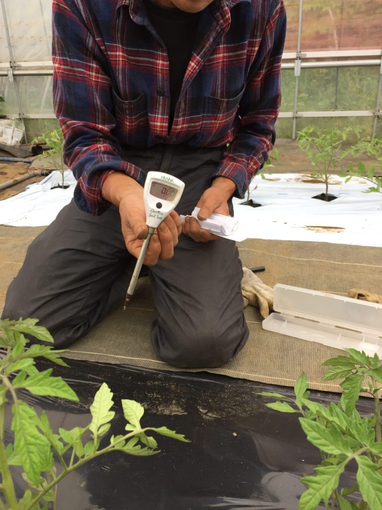 午後は、トマトハウスでトマトの定植。ECメーターで導電率を測りました。これで土壌の状態がわかるんだそうです。何がわかるのでしょうか?不明。そういうのがあるということです。安いので2万円するそうです。