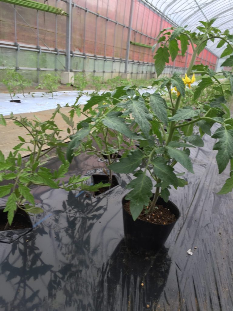 ところで、吉見さんの温室で私たちが育てるトマト苗を生長させてもらっています。下の写真は右側が私たちの苗、左側が吉見さんの苗。一見私たちの苗の方が良さげですが、これは窒素過多。緑が濃すぎて茎がガッチガチです。ホームセンターの培養土をそのまま使うと肥料分が濃すぎてこうなるそうです。培養土を砂や赤玉土で薄めて使用するのが良いようです。窒素過多で育成すると、栄養過多の人間同様、病気になりやすく、虫がつきます。栄養の付きすぎた苗を戻すのは難しいんだそうです。ダイエットが難しいのと同じですね。