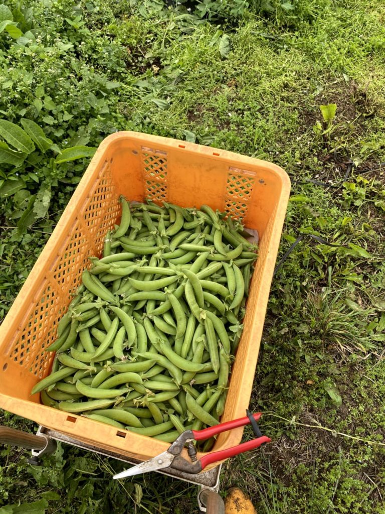 ところで、そのスナップエンドウ、100gで200円前後で売れるのです。太った鞘のエンドウから収穫すればその分高収益になるわけですが、この農園の研修生はやみくもに収穫して、農園主様からは、婉曲に、もう少し大きめのから採るとよいですね。とさみしそうにアドバイスをいただきました。すみません。
