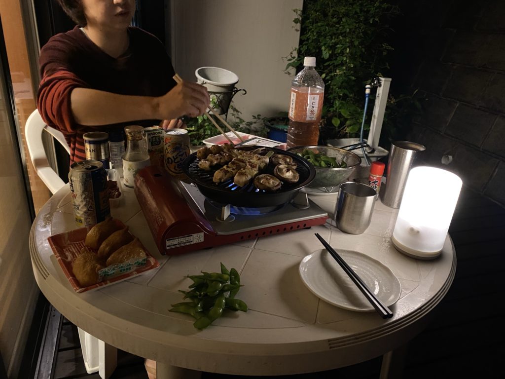 なんてこと考えて、自宅のデッキで雨の中、梅屋の焼き鳥を焼いて食べる。ひさしが短いから濡れるなー。