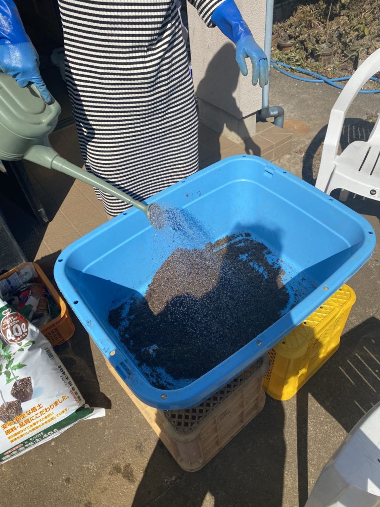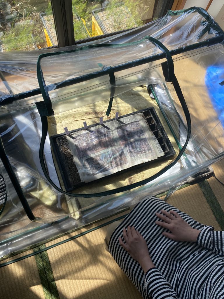 5日間湿らせて、ちょっとだけ根の出たミニトマトの種をトレイに撒きます。種まき培土を予め水に馴染ませてピンセットで播種、5月中旬までの育苗です。今度は徒長させないように、温度管理、湿度管理を徹底します。そして、Ryokoの眼力攻撃、これが大事。