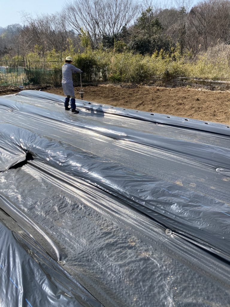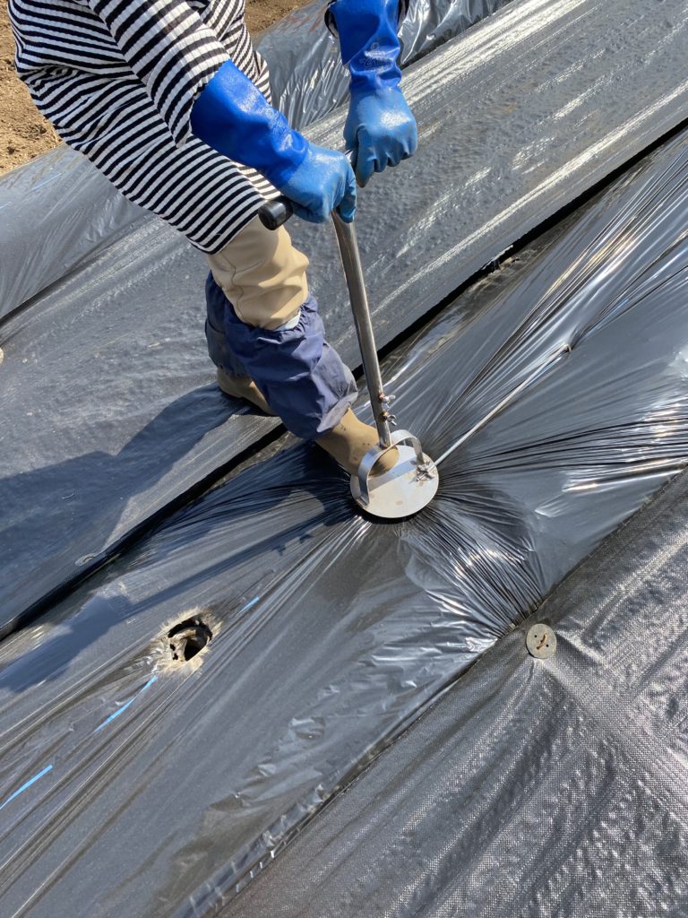 あれ、畑のマルチにすでにホーラーで穴を開けた跡が、シカくんがお手伝いしてくれたようです。少しズレてるなー。