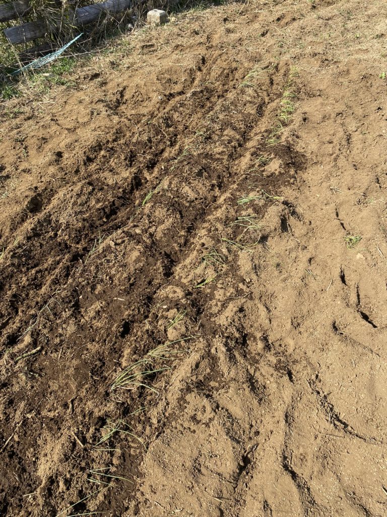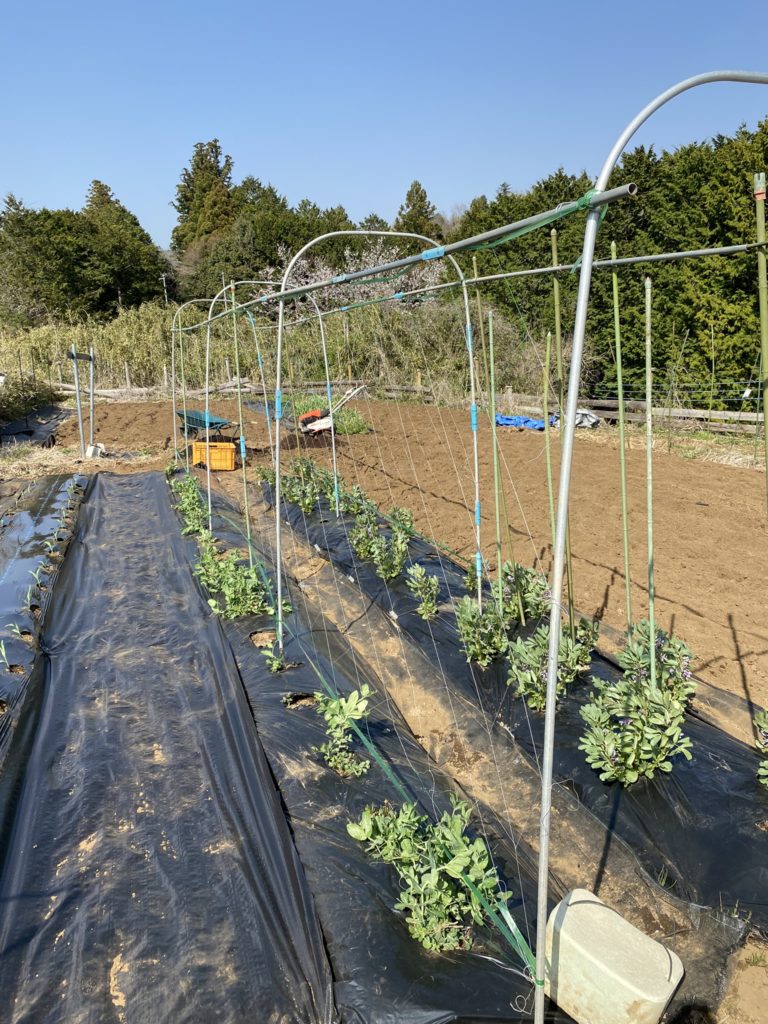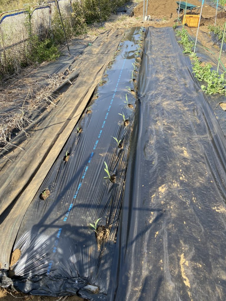 とうもろこしの定植をしました。頭の中はすでに茹でたての黄金色のとうもろこしでいっぱいです。それから、おじさんに分けてもらったネギの定植です。ネギはメッチャ強い作物ですが、雑草にだけは弱いので草抜きの手間を惜しんではいけません。これだけあればネギに困ることはありません。それから、らっきょも株分けして定植です。らっきょってエシャレットと同じ植物なのです。らっきょっていうとエシャレットよりおやじくさい印象になってしまいますね。それから、スナップエンドウとそら豆にキューリネットを張りました。最後にニンニクに液肥を散布して終了です。