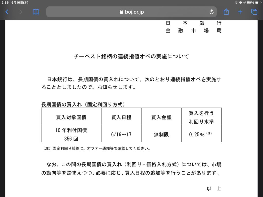 上のチャートは、日本の10年国債のチャートだ。下の通知文章は日銀が発行した無制限の国債買いの通知文。