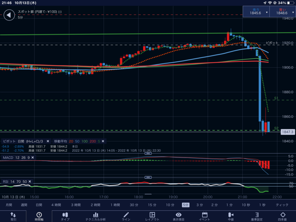 3分足なので極端に見えますが、ドル円は147円半ばまで突入。銀をはじめコモディティはは下落。何が起きたかというと、米国の消費者物価指数が発表されて、予測を上回る上昇率だったと思う、金利上げの圧力が強まり、ドル高加速しました。米国は給与水準が上がっていて、技術系の新入社員の年収は1千万円を超えたと聞きます。日本人のサラリーマンの年収で1千万円を超えるのは5%、これでは日本に優秀な人材は集まりませんし、英語が話せなければ米国で働くのは難しいので、これからの若者は英語の勉強は必須ですね。