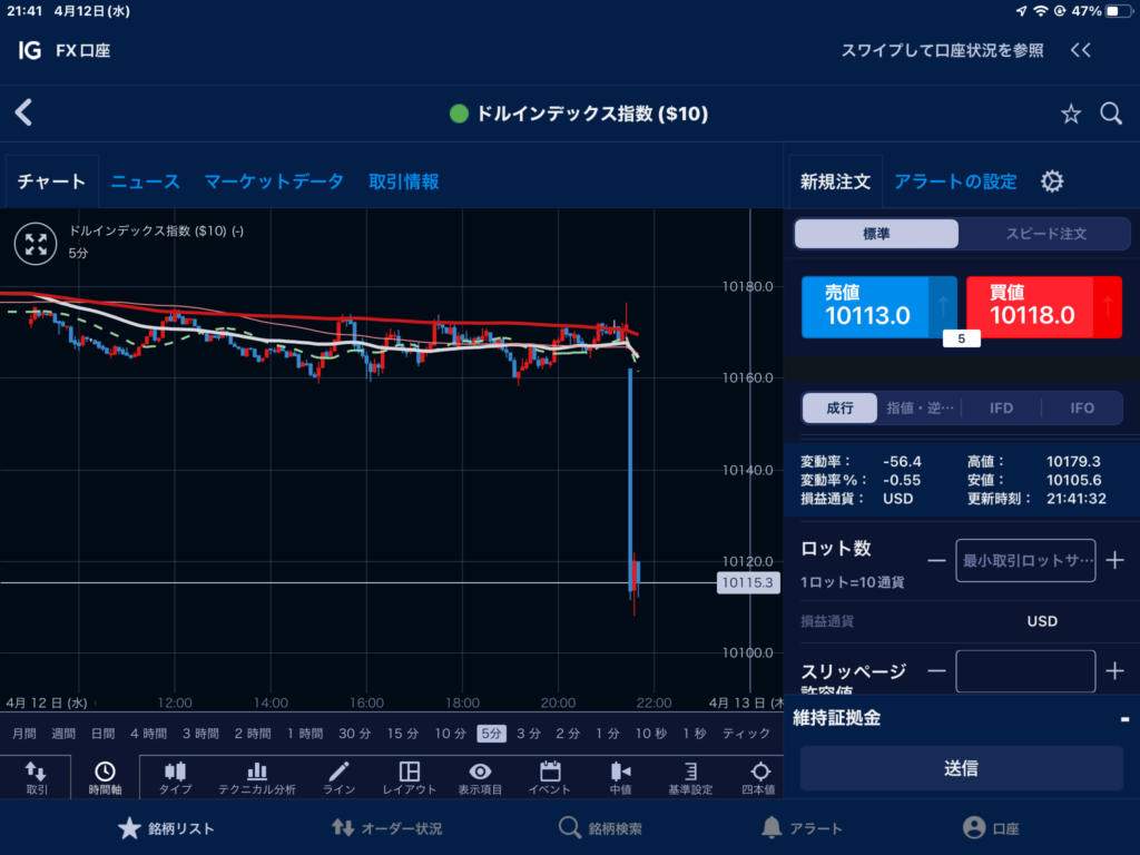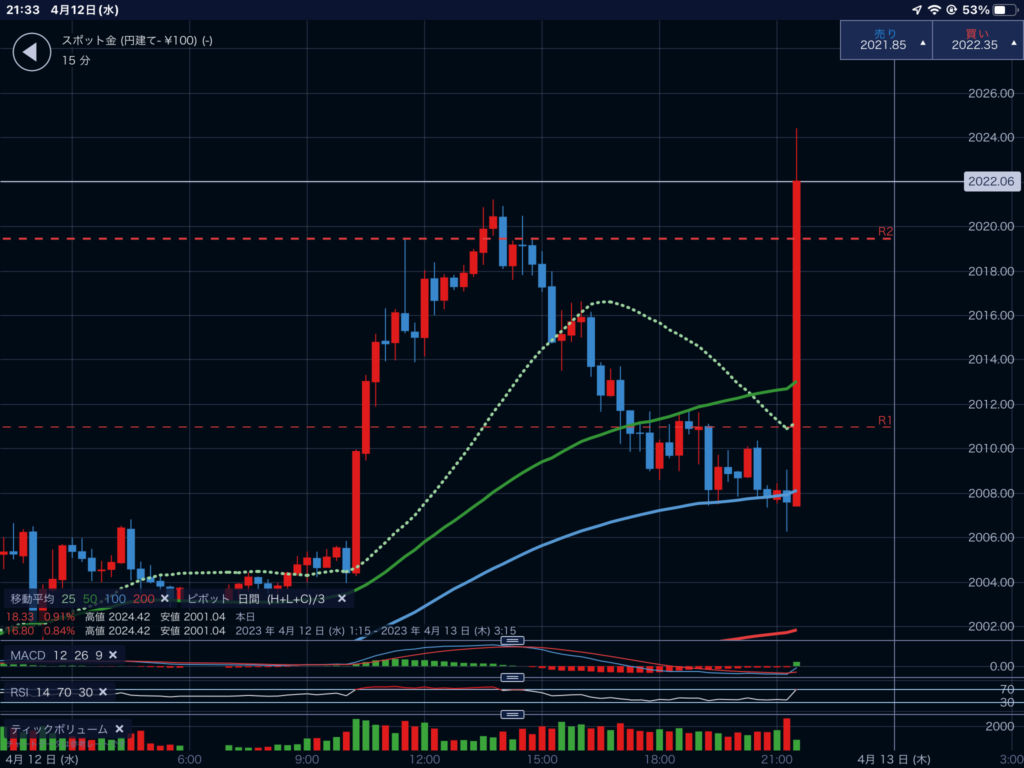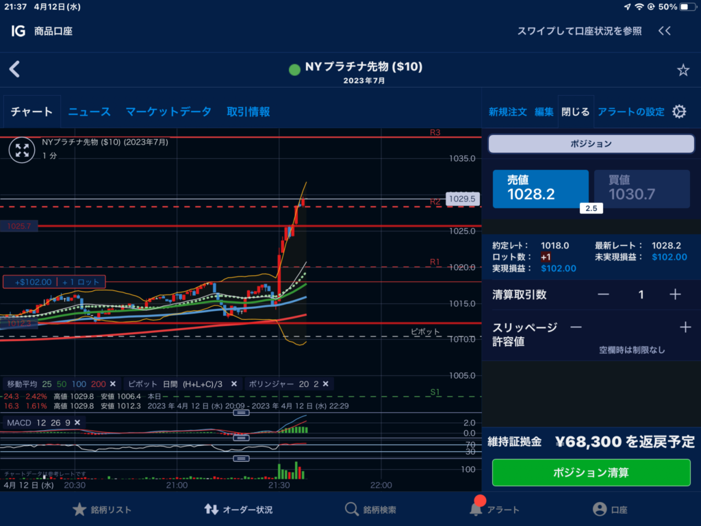 米国のCPIが2130に発表されて、市場は一気に動いた。1つ目はドル円。暴落している。CPIはインフレが収まってきたことを示す内容だったと理解できる。ドルインデックスも暴落。一方、ゴールドが暴騰。私は少しだけプラチナを仕込んでいて最後の写真。暴騰。ボリンジャーバンドを外れたところを見極めて利確した。農業資金の確保。