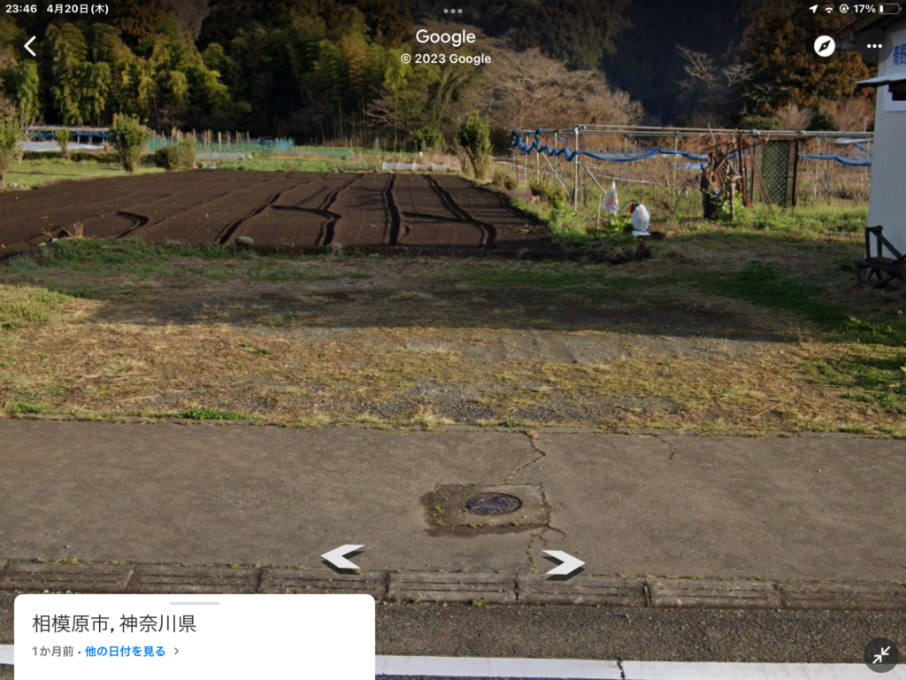 さて、もう一つ驚いたのはGoogleストリートの更新の速さ。写真のテントは2月前に、臨時物置として建てたテント、今回その左の農地をお借りできることになりそうだ。しかし早い。直売所横の私たちのメイン圃場も耕された後の画像になっている。