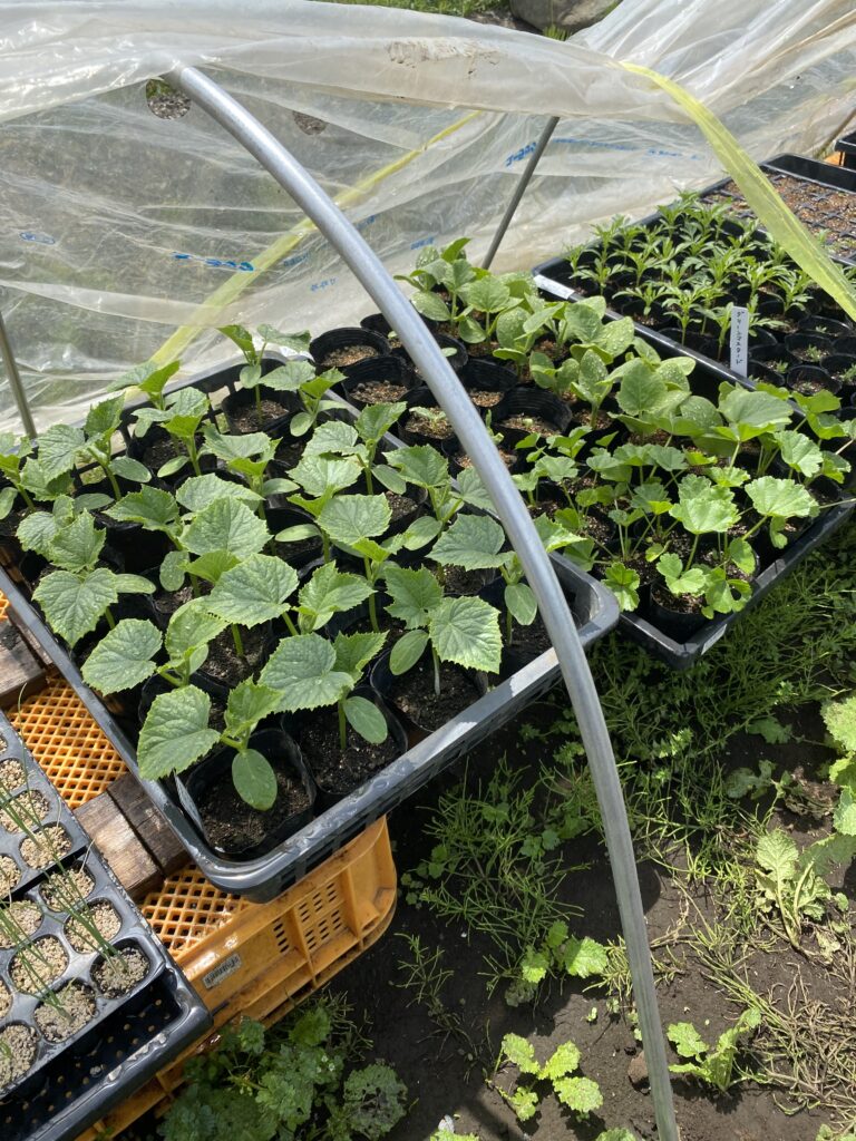 育苗ハウスの建設が遅れて、育苗トンネルを設置。さまざまな農場で定植が始まっている中、まだ育苗しているへっぽこ農家。青野原は道志川から水を引き上げて至る所に蛇口があります。助かります。きゅうりはもう定植できそうです。コロたん メロンもどさくさに紛れて育苗中。双葉がかわいい。それとマリーゴールドの苗も。リョウコの姿が農家っぽく、カッコ良い。