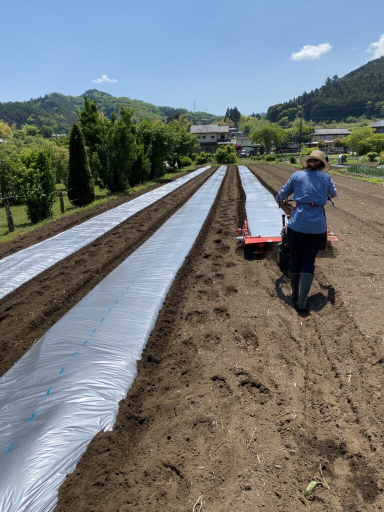 ようやく畝幅を135センチに変更できてシルバーマルチを張ります。60m、4本の畝。色はシルバーです。黒の方が当然メジャーなのですが、シルバーにするとアブラムシが方向感覚を失い、来なくなる、本当らしく、農家さんはアブラムシを避けたい場合、シルバーマルチを使ったり、CD盤を吊るしたりします。ピチッと張ったマルチを見たお隣さんが、いやー綺麗ですねとお褒めのお言葉。これが、あの金貨で買ったマルチャー。既に1箇所破損。ところで恒例のオーマイガーッど、途中で気づいたんだけど、シルバーマルチ200m しかない。計算では4本目の途中で、ショートするはず。アンのショー、。ショートと同時に正午になり、丸チャーを放り出して、コメリ にマルチを買いに、シルバーなんて粋なものはなく、黒マルチを購入して、ふれあい農園のテラスでRYOKOお手製のおにぎりを食べます。