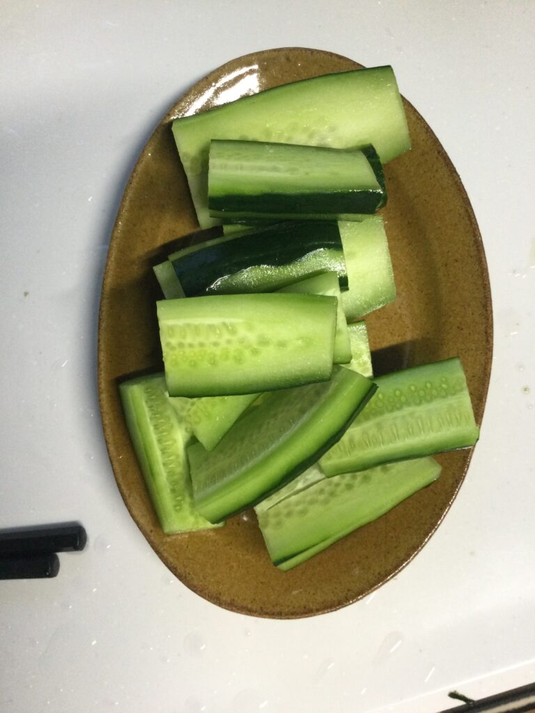 今日の晩飯は、モロキューにきゅうりの浅漬け、それとズッキーニのピザ、それと先日のアジの開き。
