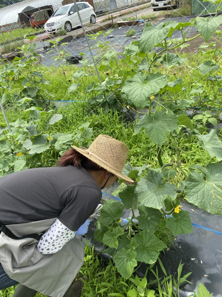 最初の写真はとうもろこしの圃場です。右に見える畝と手前の畝では生育が全然違います。右の畝の方が先に定植したのですがビニールをかけずに生育させました。丈も伸び切らずに雄花が開花してしまいました。小ぶりなとうもろこしになりそうです。一方で手前の畝は遅れての畑直播きでの育成、そのかわりビニールを掛けました。大きく育って、昨日ビニールをとりました。なす、ピーマン、カボチャ、きゅうりには初期育成にビニールを使い、その効果に驚いているところです。青野原はキャンプ場の多いところで夜は高原のように涼しくなります。アンデス育ちのトマトはそういう気候が大好きですが、いわゆる、その他の夏野菜は暑い方が好きなんです。これも勉強です。