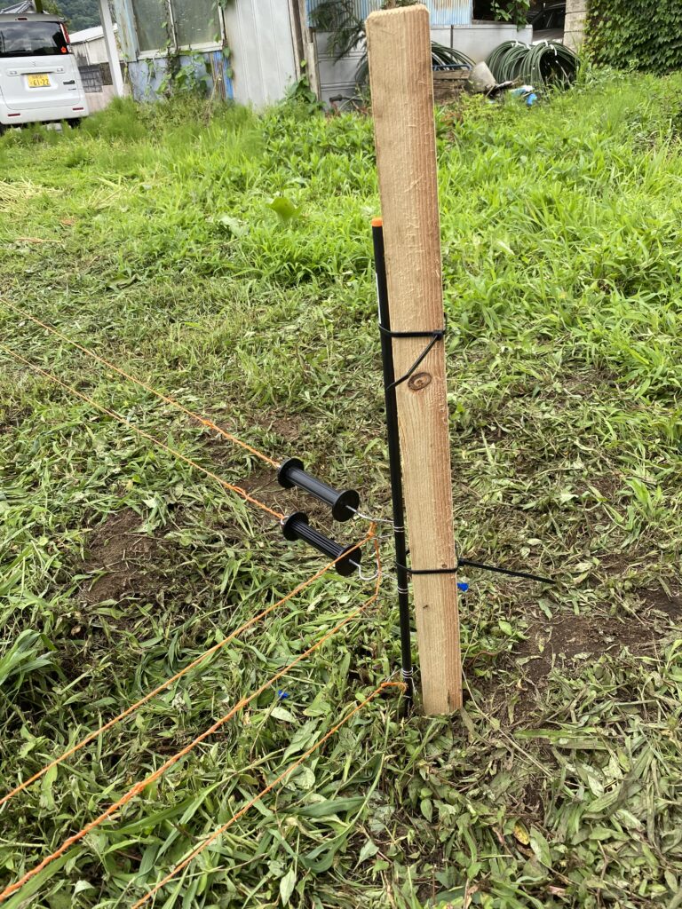 本日は金曜日ですが、お休みを頂きました。この畑は、とうもろこし、枝豆、落花生とハクビシンとアライグマ、タヌキの大好物畑。明日の施工でも間に合ったのかもしれませんが、昨年、収穫予定の前日に1本除いて全部やられたので、噂ではハクビシンは農家の家に盗聴器をしかけている。明日収穫の前日にやられたという農家は少なくない。ハクビシンは今日私は出社だと思っていたに違いない。敵を欺くには味方からの格言どおり、まさか、今日、電気柵を張られるとは思っていなかっただろう。こんな雨の日に。ウフフ。しかも、ハクビシンに合わせた、地表10センチからの10センチ刻みの超ロースタイルの電気柵。参ったか。