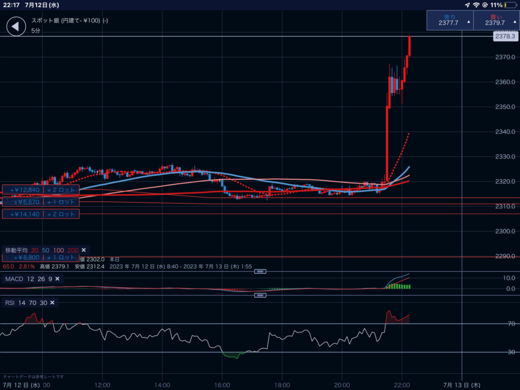 本日は、米国消費者物価指数の発表。ドル価格と反比例に相関する銀を5日前に購入して準備して、見事的中した。発表から1時間で相当な利益で利確して。