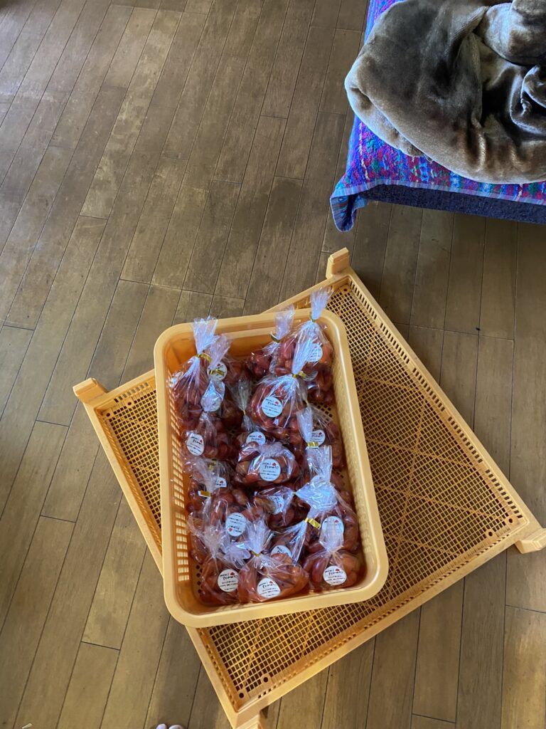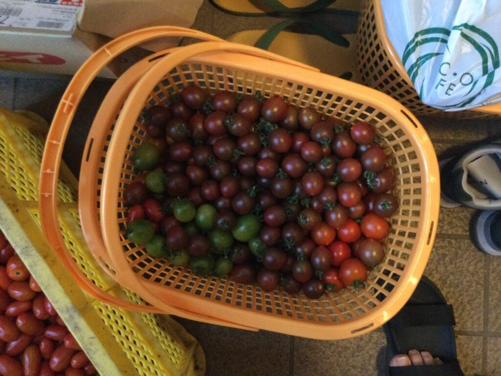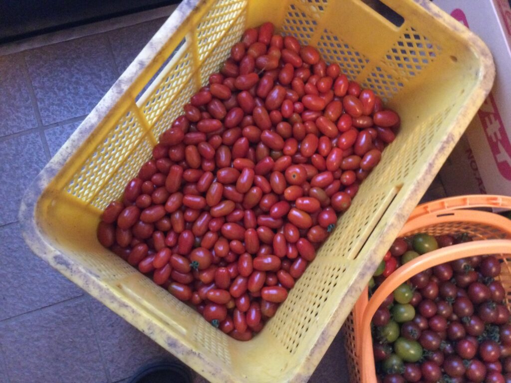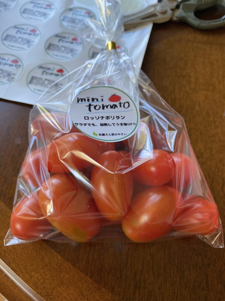 昨日収穫したミニトマトを直売所に出荷します。40袋、1000個程度のミニトマトをペーパータオルで1つずつ拭きながら検品して、重量を測りながら袋に詰めます。袋にはあらかじめシールを貼って感じをよくします。みんな見てんのかしら。安けりゃ良いってもんじゃないのよ。