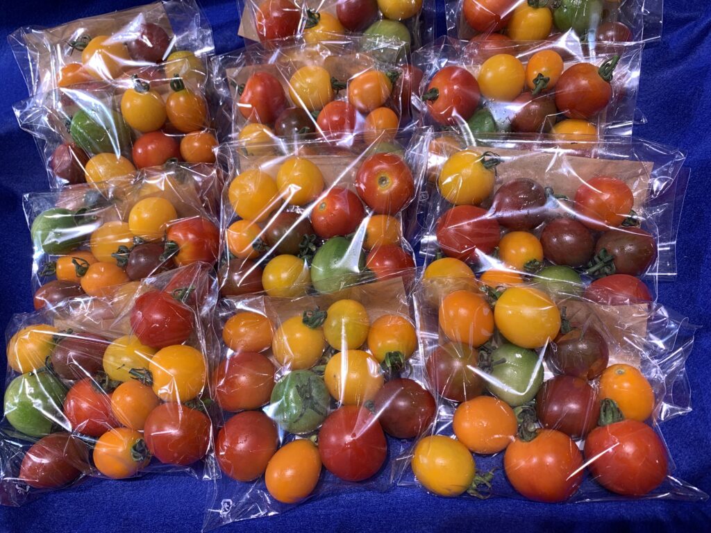 写真2枚目はサミットでの販売の様子、カラフルトマト。