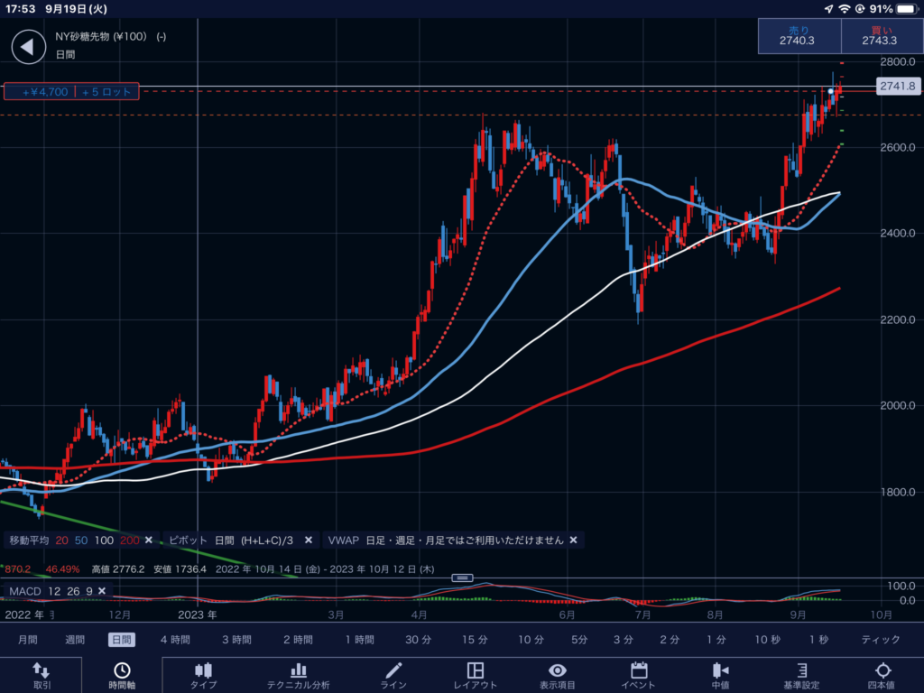 こういう時投資家は、高値掴みを恐れて手を出さないのか?というと否。最高値を突破した瞬間はその時砂糖に投資している人は誰も損をしていない状況だから、まだ上がるんじゃないかと誰も売らない。誰も売ってくんないから買わなければいけない人は高額でも買うのでまた値が上がる。
