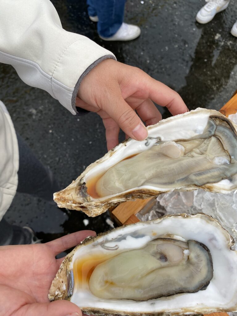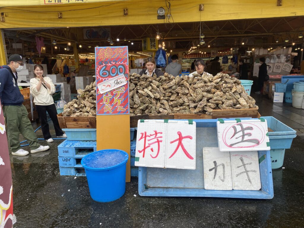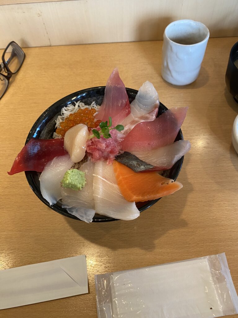 ここも楽しい。さっきは静かだったが8時に戻ると、お客さんで相当な賑わい。なぜか北海道産まで売ってる。Ryoko 鹿島灘は、イカ、ヒラメ、アンコウ。そのあたりを買え!それは地場産だ。山盛りのイカ500円、マグロの中落ち山盛り500円、生牡蠣を購入した。そして遅い朝飯は海鮮丼。