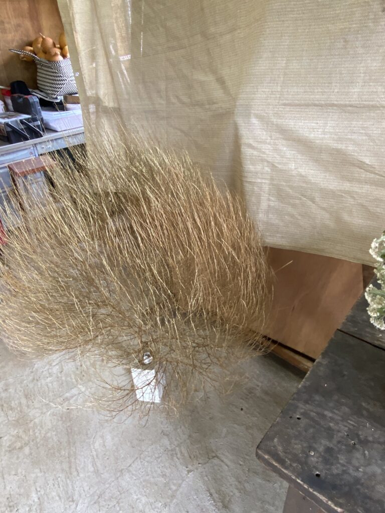 直売所を飾ります。直売所はガラス越しに中は丸見えなので雑然としておくわけにはいきません。ドライフラワーで飾って、頂いたスプレイ菊で、花瓶で飾ります。Bunbun後の木、の細かいやつ、写真撮っといて、畑で片付けしてたら飛んできたのよ。形が可愛いから、金色にスプレーしてみた。意外と良いでしょ。うまく写るかわかんないけど。パシャ。