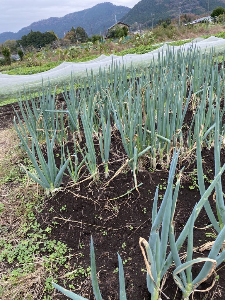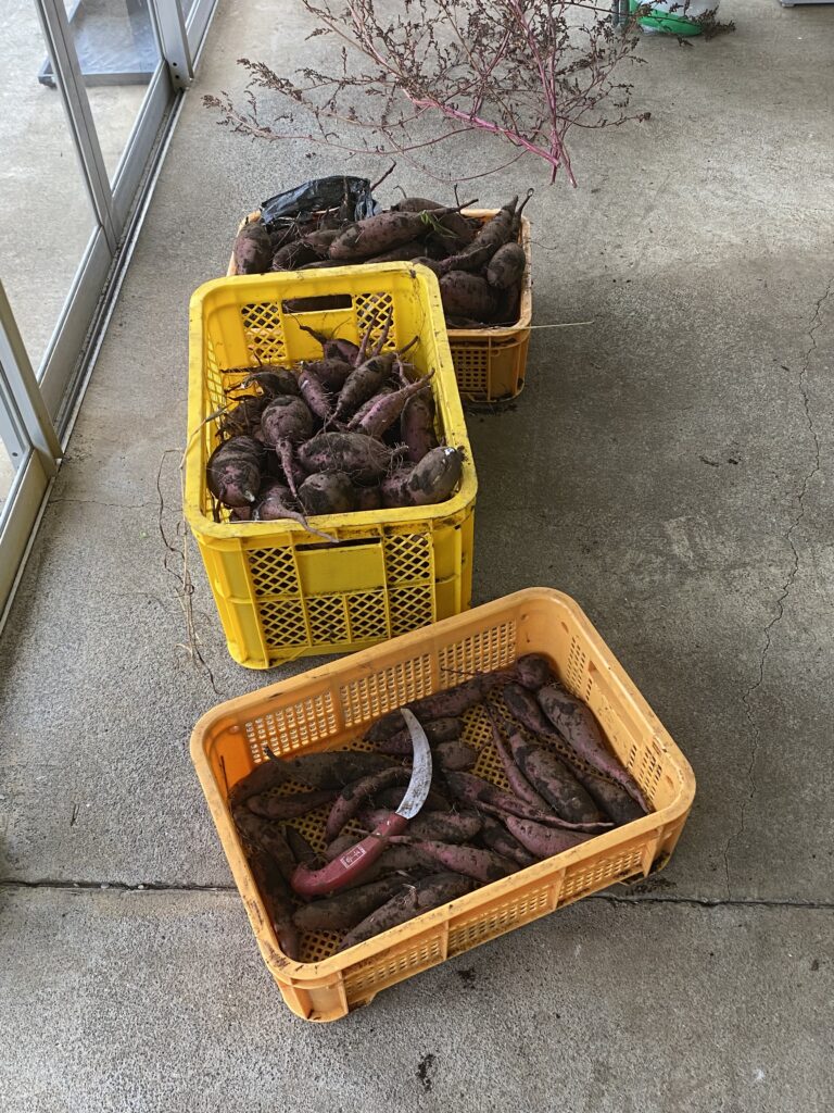 玉ねぎはくたっとしてますが、枯れたようになって冬を越します。そして思い出したかのように成長を始め、梅雨前には立派な玉ねぎになります。掘ったさつまいもは泥付きのまま保管します。