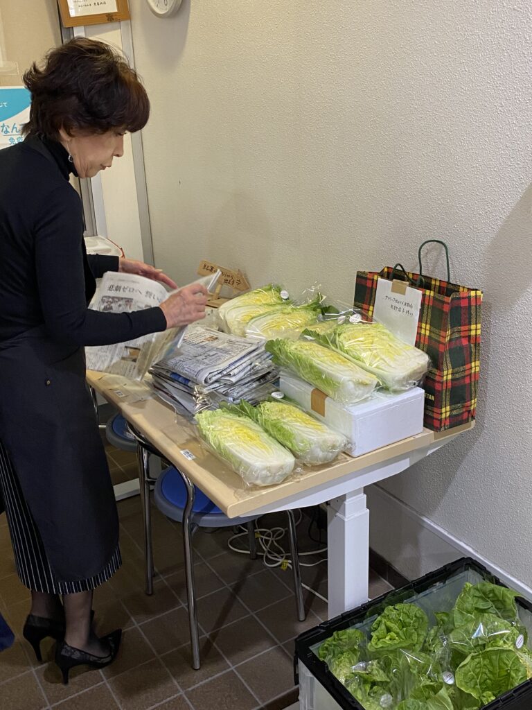 すでに梱包準備が始まっていて、ボランティアの方が、まー綺麗な白菜!と、みんなきっと喜ぶわ!と言ってくれます。あの、これ、小さいですけどこういう品種なんです。白菜は無農薬栽培は難しいんですけど、すごく低農薬で作ってます。と、言い訳なのか、アピールなのかわからん説明をします。喜んでもらって無条件で嬉しい。直売所では、小さいから、150円かなって、みそかすにされてきたもんだから、嬉しさ100倍!SNSでご寄付頂いたって報告しますが、佐藤農園様で良いですか?あの、佐藤農園だと山ほどあるので、青野原佐藤農園でお願いします!と、調子に乗って意味不明なこだわりを見せます。