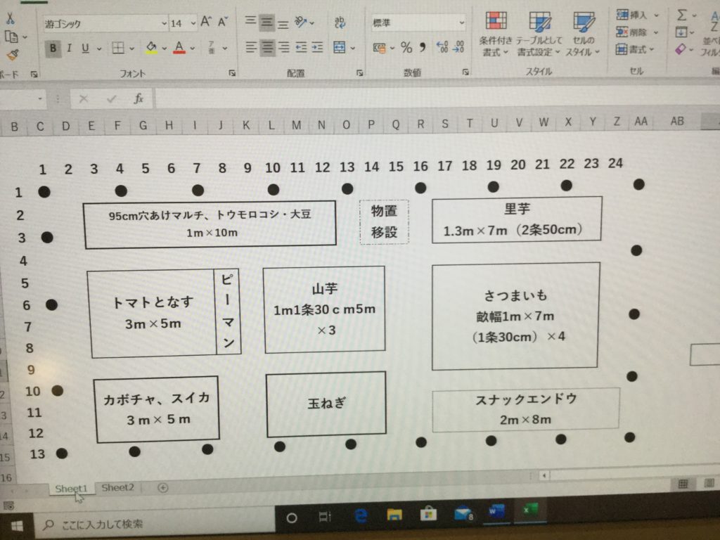 下の畑の作付計画です。●は電気柵のポールです。電気柵の設営は連休明けになります。下の畑には芋類を中心に作付けます。イノシシ の好物です。それを食べにきたイノシシ が、ぐふふ、鼻で、クンクンして、ぐふふ、電気柵に触れて、シビれるわけです。食堂は閉店です。イノシシ は畑から駆除されます。ムフフ。