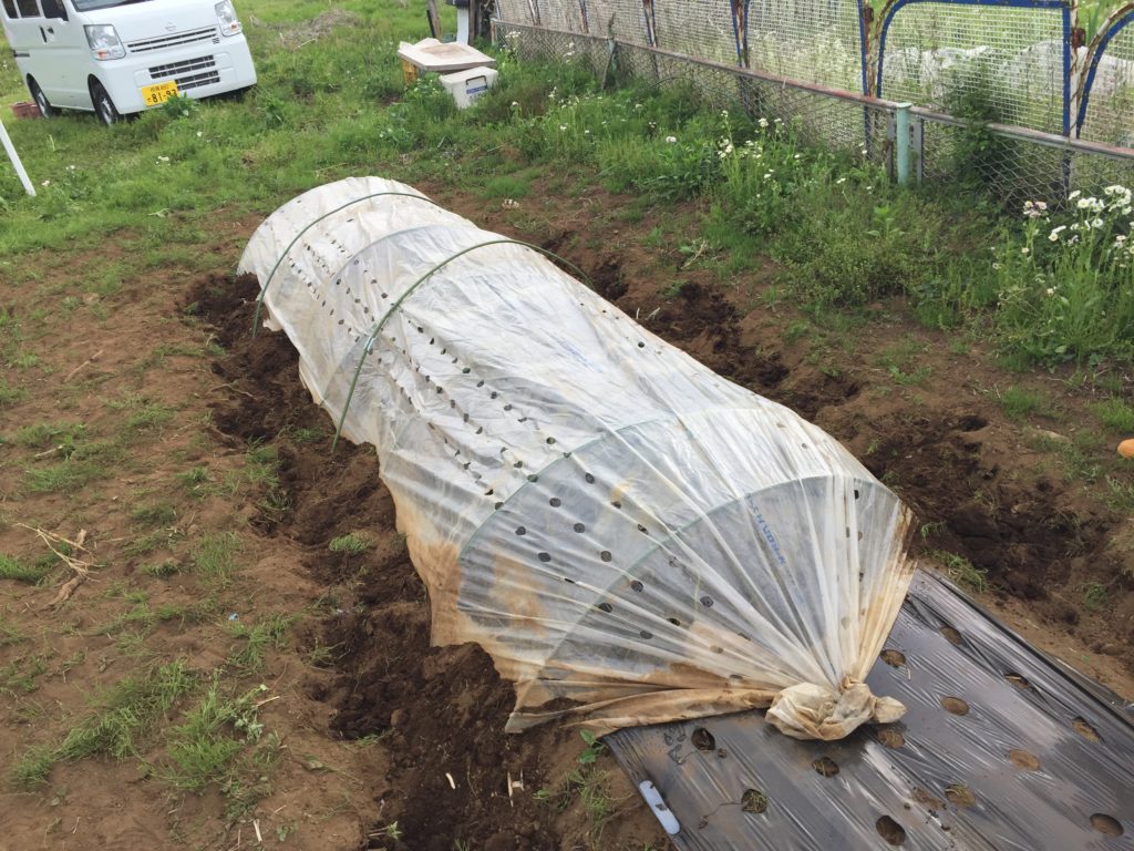 このビニールトンネルの中でサツマイモの苗を再育苗しています。買った苗をそのまま植えると根ばかり伸びて芋の付きが悪いからです。また、苗も倍増します。200本になります。1苗で5コ芋が付いたら1000コの芋。冬に、焼き芋の行商に出ます。決して探さないで下さい。