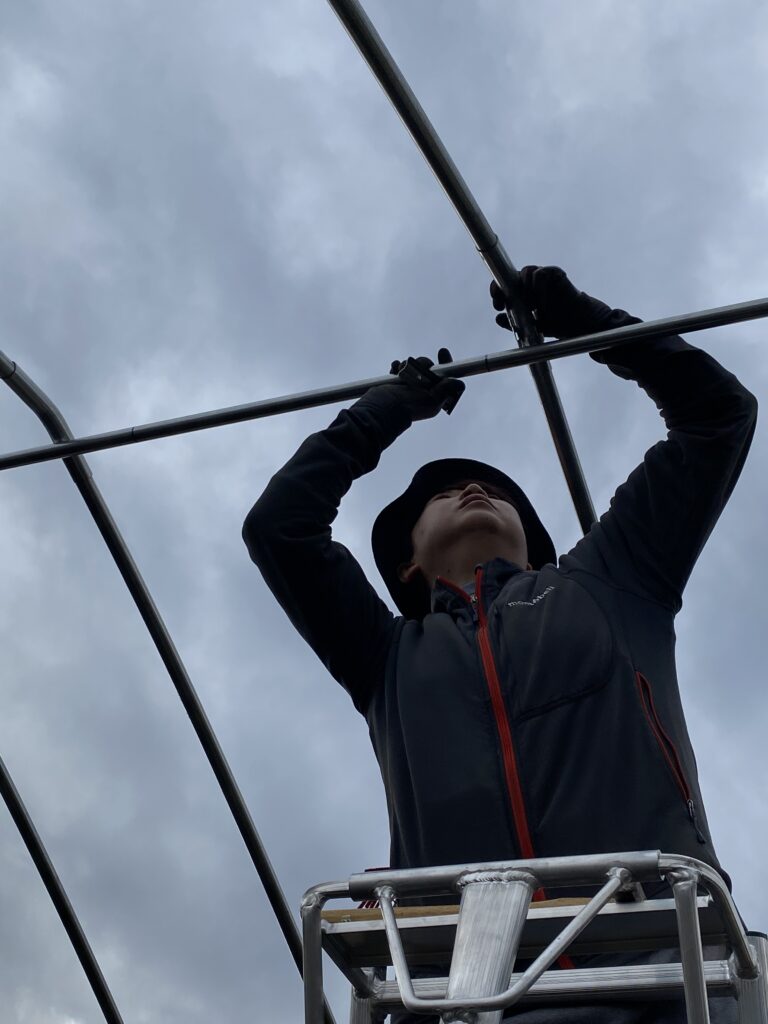 次はまっすぐのパイプを尾根に沿って接続金具を使って繋いでいきます。この作業はRyokoがやりますが下でパイプを右に左に引いてセンターを合わせて行きます。