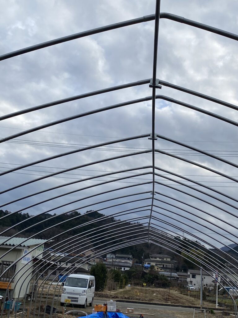 尾根を繋いでこれから7本のパイプを横に通します。少しずつまっすぐに、頑強になっていきます。怪我なくここまで組み立てられました。恐らくここまでで25%の進捗です。2月中を目途に完成させたいです。
