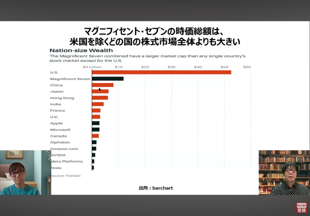米国株、異常だろう。更に、その中のマグにフィセントセブン。この7社で日本市場を凌駕している。実態とズレている。バブルなんだよね。しばらく続くよ、きっと。ただ、米国が金利を下げるその瞬間がはじける合図になるよ。