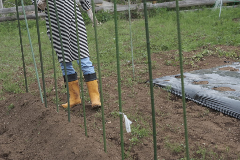 トマト用の支柱を組み立てました。実が付いたらビニールをかけて雨が当たるのを防ぎます。手前の穴あきドームでは、ナスを栽培中です。