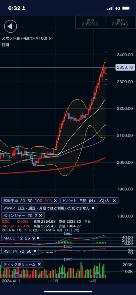 下のチャートはゴールド、まだ、ボードウォークを続けている。金利が下がらないとなると、ゴールドも下がるのが一般的だが、最近はドルの強い弱い関係なく上がり続けるいる。