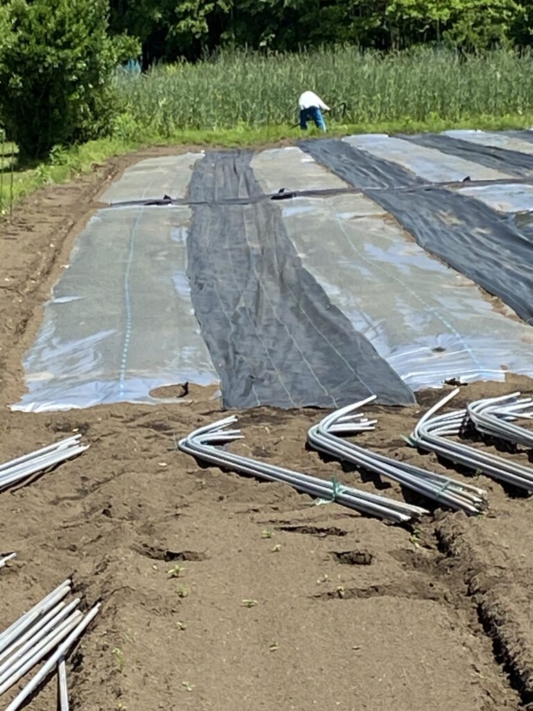 今年は直売所の畑でミニトマトを栽培します。GW😗に銀色のマルチを張り、畝間には防草シートを伸ばして夏場の雑草取りの作業を軽減させます。マルチは150センチ幅の銀色のマルチです。銀色は虫除けと同時に地温の上昇を防ぎます。芯芯2mで張ると畝間は80センチになり1mの防草シートがピッタリ!少し重なるのがとても重要です。