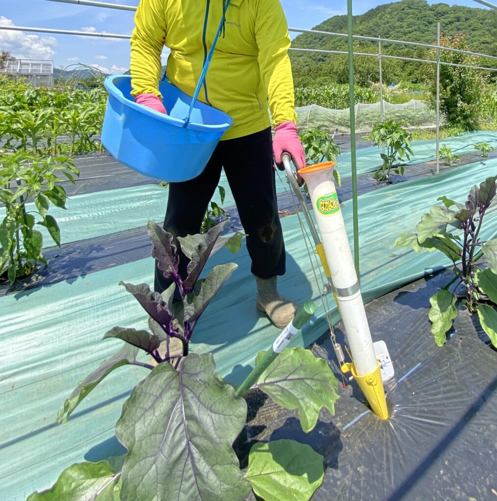 農作業日誌 追肥 20240608 2024年6月8日 2024年6月8日 bunsen@bunsen なすはとうもろこしほどではないけれど肥料をよく食べます。化成肥料を追肥に使う農家さんがほとんどですが、実が固くなるので、なたねの油を搾ったカスを使います。有機農家さんはこれを使うことが多いです。 そして登場するのが農家さん必携アイテム なかよし君 です。 この機械は先端がクチバシのようになっていて、土中にクチバシを突っ込んでレバーを握るとクチバシが開きそこに肥料をながしこみます。 単純な作りなのですが、定植や追肥の時に大活躍です。 Facebook postはてブLINEPocketFeedly