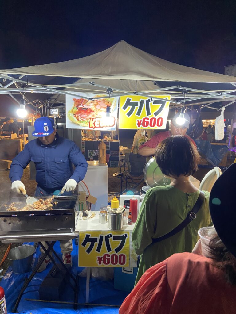 日が暮れて、マルチャーを洗って、上野原の100円ショップで買い物しようとしたら、桂川でフェスティバルをやってました。楽しそうで寄って、ケパプを食べてきました。