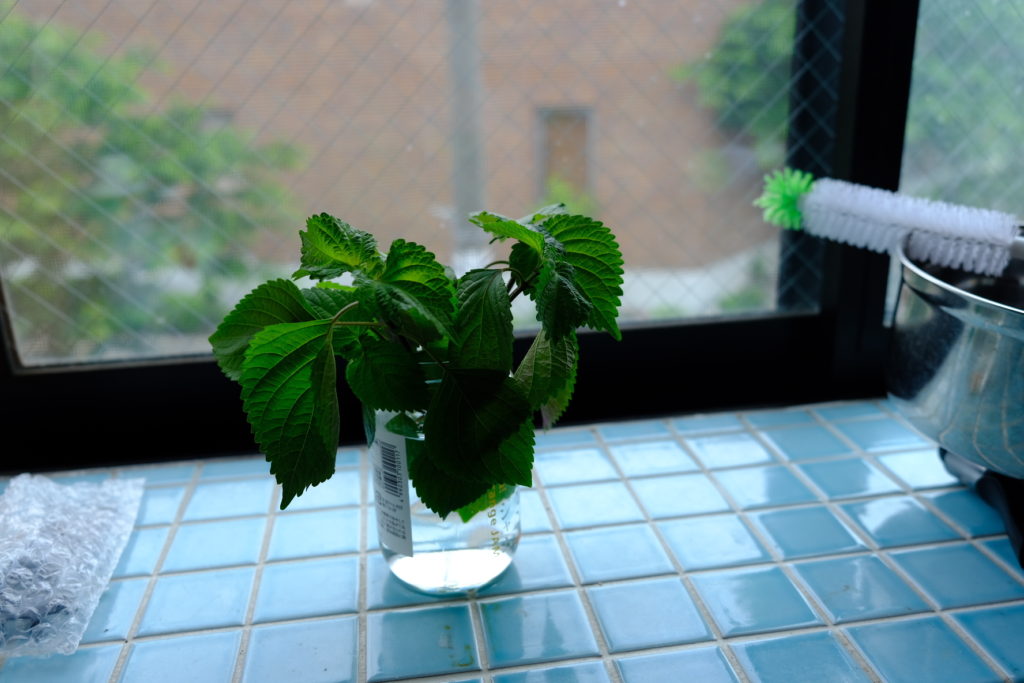 シソ。挿木で水栽培。根が出たら畑に植えます。