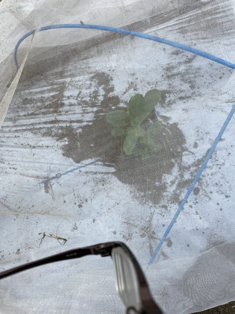 定植したそら豆君は順調に網の中で育ってます。網かけないと鹿君に食べられてしまいます。