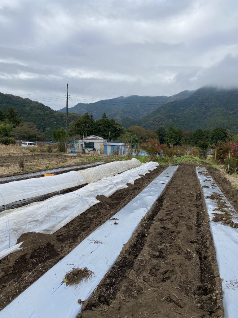 この時期は、不織布とビニールのトンネルをかけないと生育しません。小屋から持ってきます。ryoko が種まき、Bunsenがトンネルかけ、種蒔く前にトンネルかけないでよ、遅いんだよ、いけね、タネ踏んじゃった。もーう、ばかちん。へっぽこ農家のへっぽこ作業が続きます。