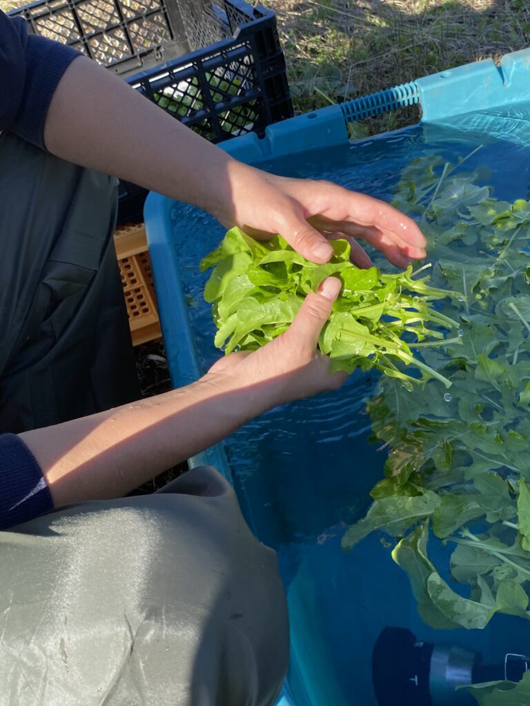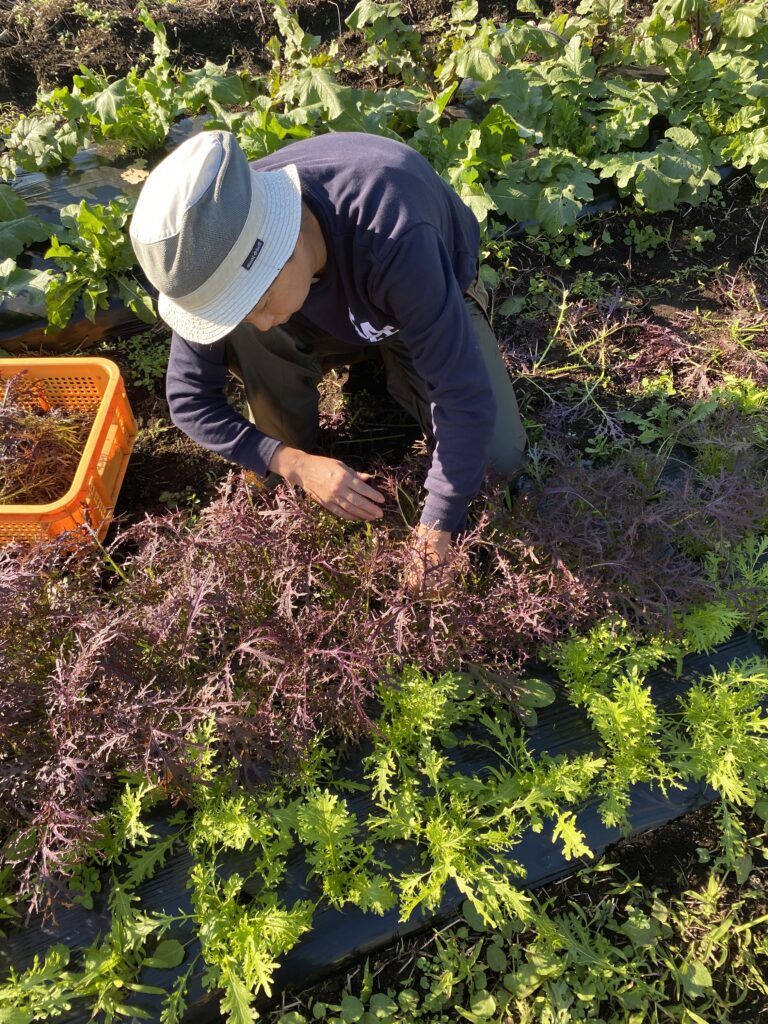 からしみずな、マスタード、ルッコラなどのハーブを一葉ずつ美味しそうなところだけチョキチョキ切り取ります。Ryoko 社長のこだわりでこの作業はRyoko 以外できません。虫喰われを避けて、硬くなってしまったのを避けて収穫します。20個分収穫するのに1時間以上を要します。