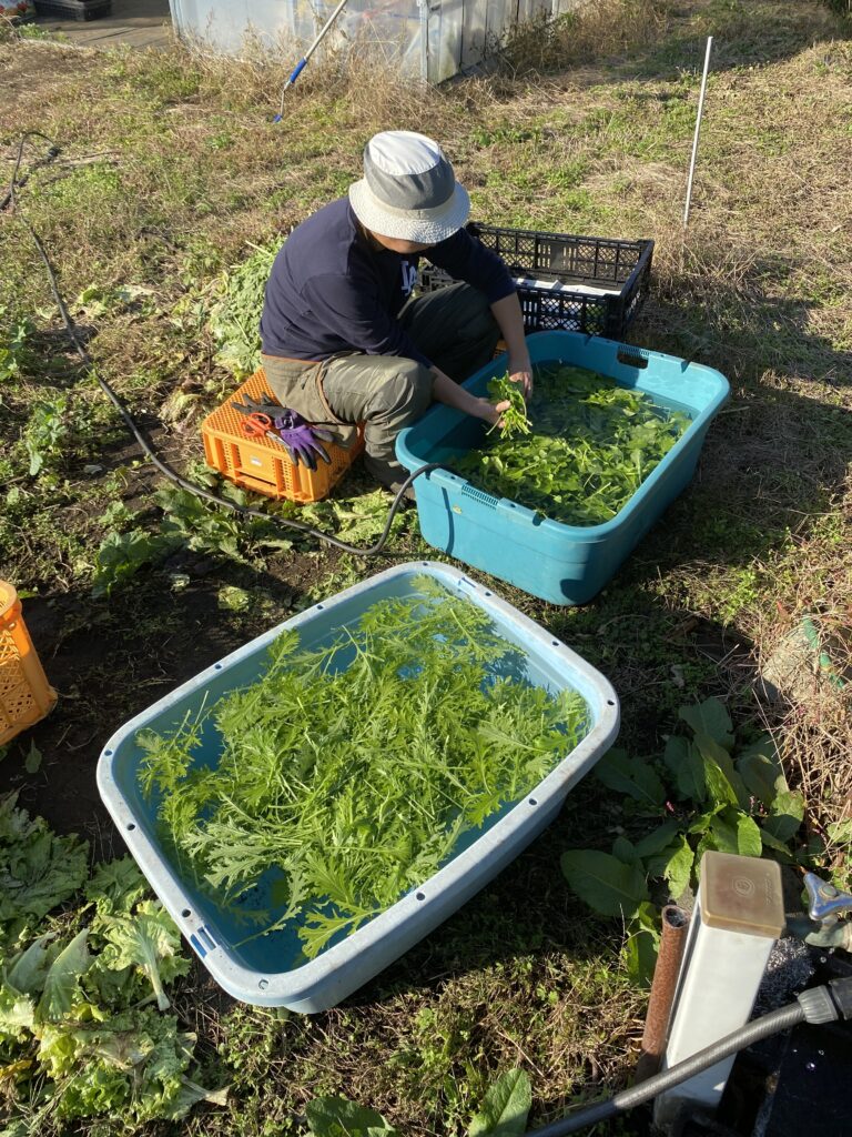 その後、丹沢の沢水を引き込んだ畑の用水を使って、これまた1枚、1枚、土を落として、虫を確認して、形を揃えて、硬い部分を切り落とします。この作業で2時間はかかります。