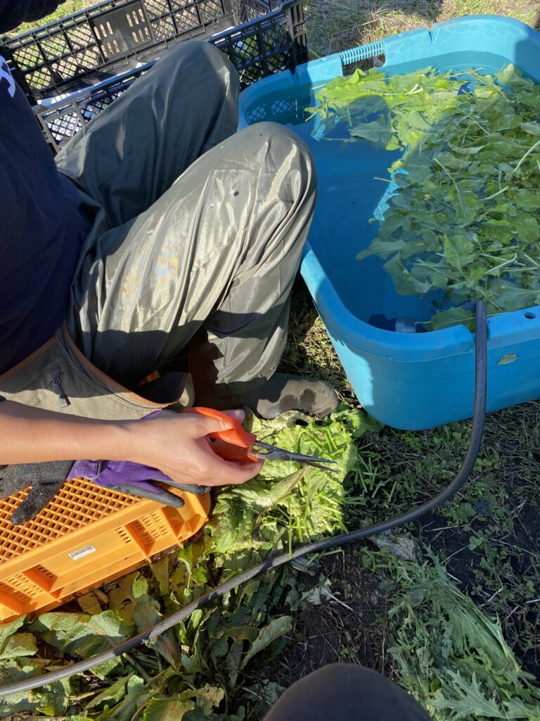 終わった頃には陽が傾いて、そうだ、初めての納品だからグリーンジャケットをプレゼントしちゃおう。と、サニーレタスを収穫に行きます。この時点ででニンジンの作業は日没順延が決まりました。