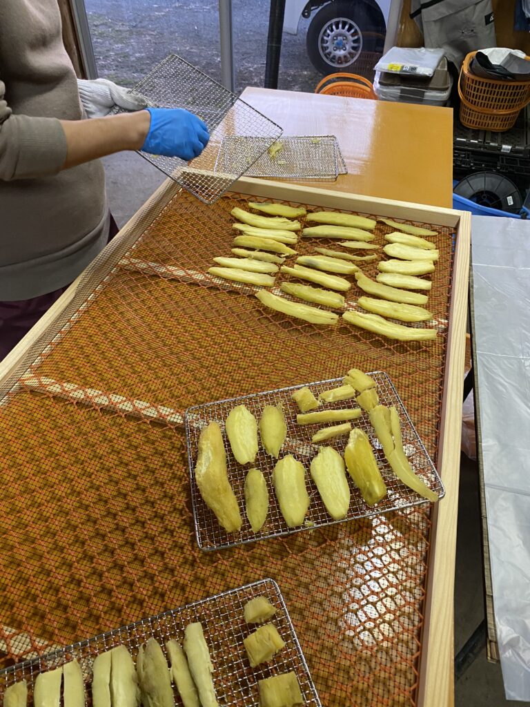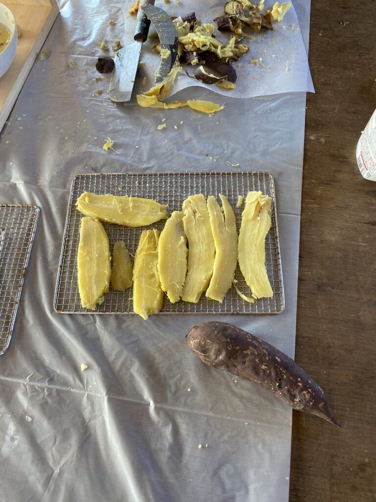 ビビったのは芋を削って芯の部分を干し芋にするのですが、たくさん用意しても干すときには干し台1枚にもなりません。これでは100g2千円でも収支が合わないかもしれません。世の中にうまい話はそうは落ちてませんね。