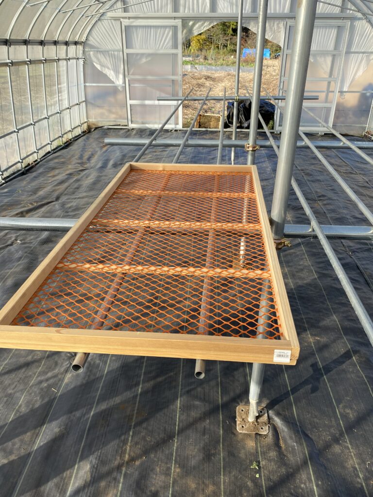 ハウスの中に防草シートを張り詰めて、埃を抑えて、芋の干し場にします。雪害用の支えの単管パイプとハウス用のパイプを番線で繋ぎ、干し台を作ります。