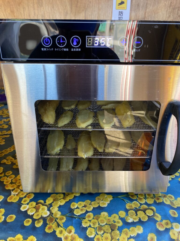 芋の乾燥には風通しの良い、陽当たりのよい場所がベターですが、雨に当てるわけにもいかないのでハウスの中で干したりするのですが、最近の異常気象で乾燥がスムースに行かず、本場茨城でも乾燥機を使ったり、乾燥機を使った後、天日干しにしたりするそうです。