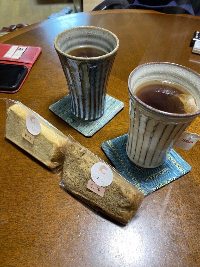 藤野に帰り、紅茶と一緒にシホンケーキを頂きます。ティーカップは最近お気に入りの冬は焼酎のお湯割、夏はビール 用のカップでたっぷり入れます。畑の時は紅茶を飲むとトイレに行きたくなるので飲むのがビビられますが、今日は安心です。