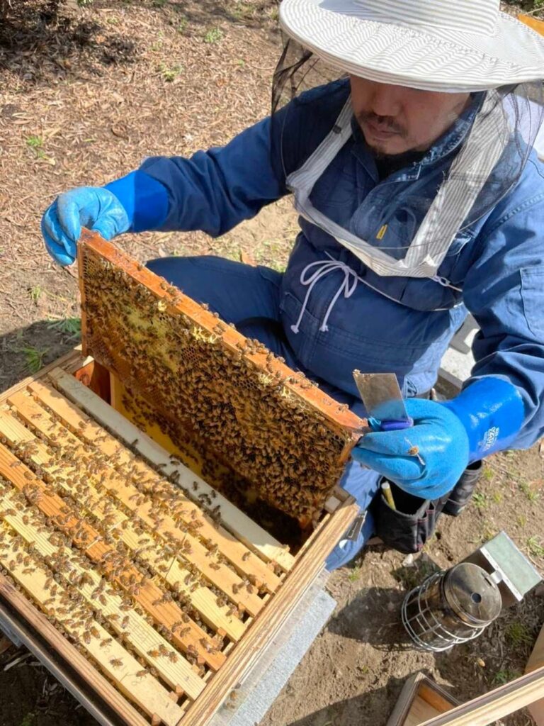 農家でもかなり際立っているのが養蜂家です。吉見さんのところに来ている研修生は農業大学で8の研究してて、自宅の天井裏には蛇を飼っているという、際立っている好青年。F君。