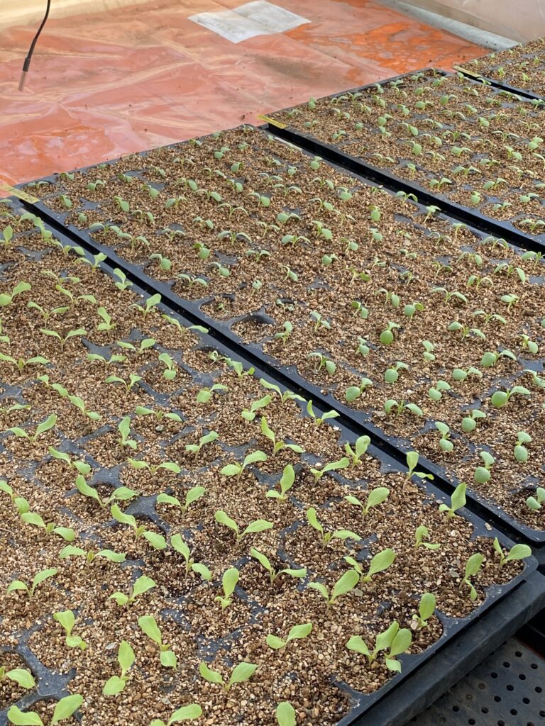 やや徒長気味かな。徒長って、ヒョロ ということです。高温、日照不足、加湿が理由で、苗が気持ち良くない状況で少しでも伸びて違う環境を望んで、ヒョロっとなってしまうのです。夜間に締め切って加温するので徒長しやすいのでしょうか。神経を使います。マットの加温開始温度を15度から13度に下げてみます。