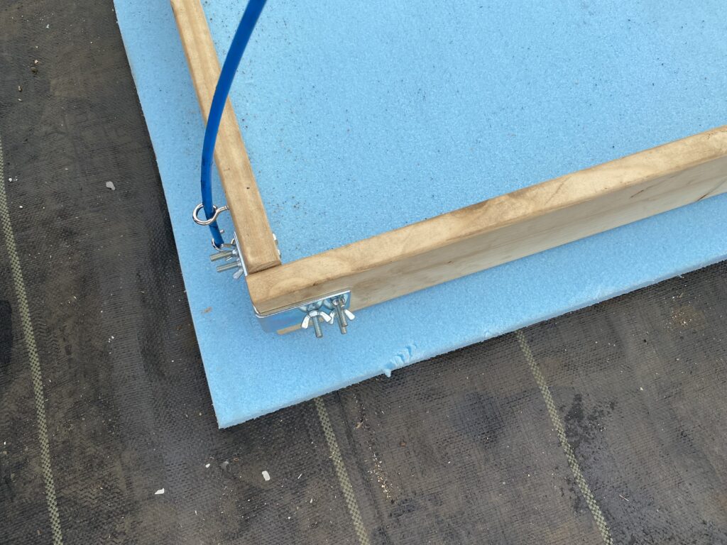 電熱マットは木材で周囲を固めてその内側をビニールで覆い、床は2.5センチの断熱材を敷きます。更に不織布、ビニール、プチプチでトンネルにします。