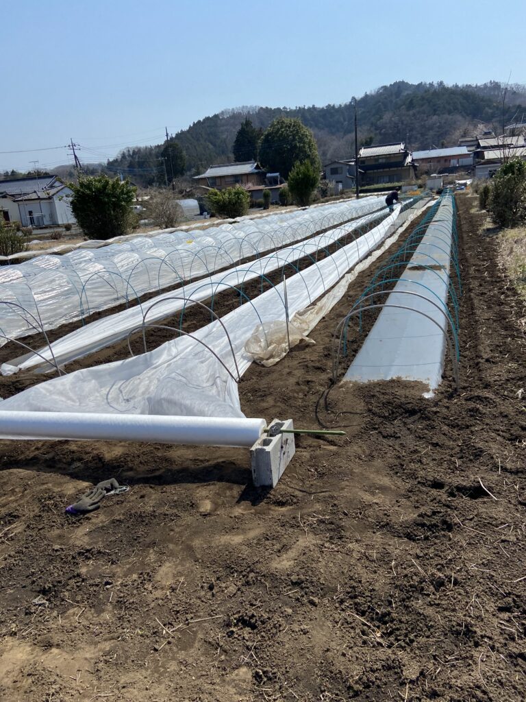 夕方までかかり全数定植、この畑で2000本。トンネルでの栽培は4千本を予定しています。苗も育ってきていて、1週後、2週後に8トレイ、1000本ずつできる予定です。
